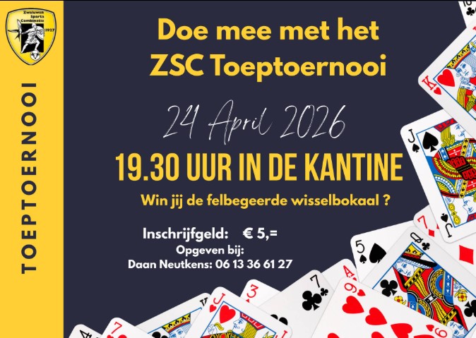 Toeptoernooi ZSC Geplaatst door getpraut 3 april 2026 Aan 3 april 2026 Toeptoernooi ZSC door ZSC Westerhoven 28 28 people viewed this event. Win jij de felbegeerde wisselbokaal? Inschrijfgeld € 5,-Opgeven bij Daan Neutkens / 06 13 36 61 27 Registreer voor evenement Datum en tijd 24-04-2026 om 19:30 naar 24-04-2026 Locatie ZSC Westerhoven Evenement categorie Game or Competition Deel met vrienden Facebook Twitter LinkedIn Xing Pinterest
